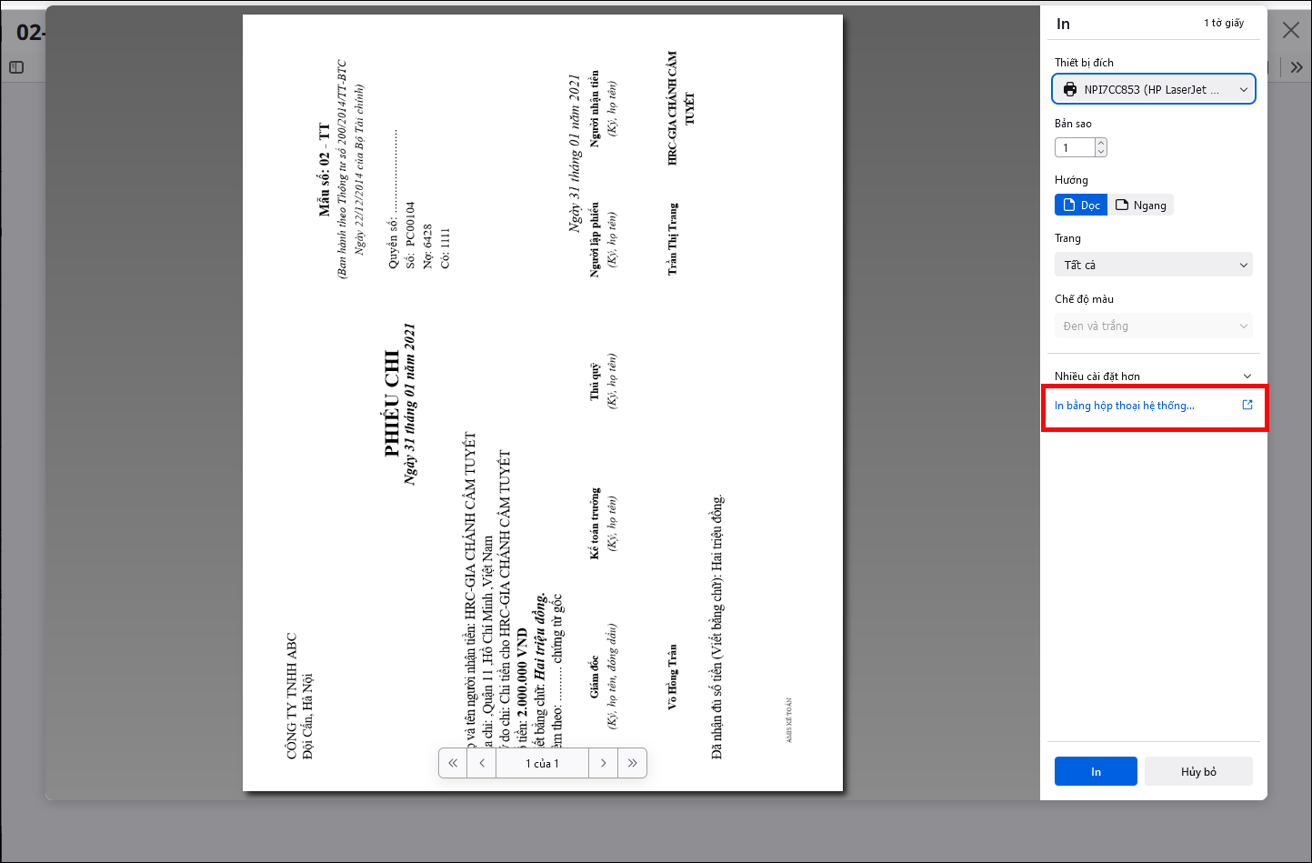 - Khi thực hiện in, chọn In từ hộp thoại hệ thống