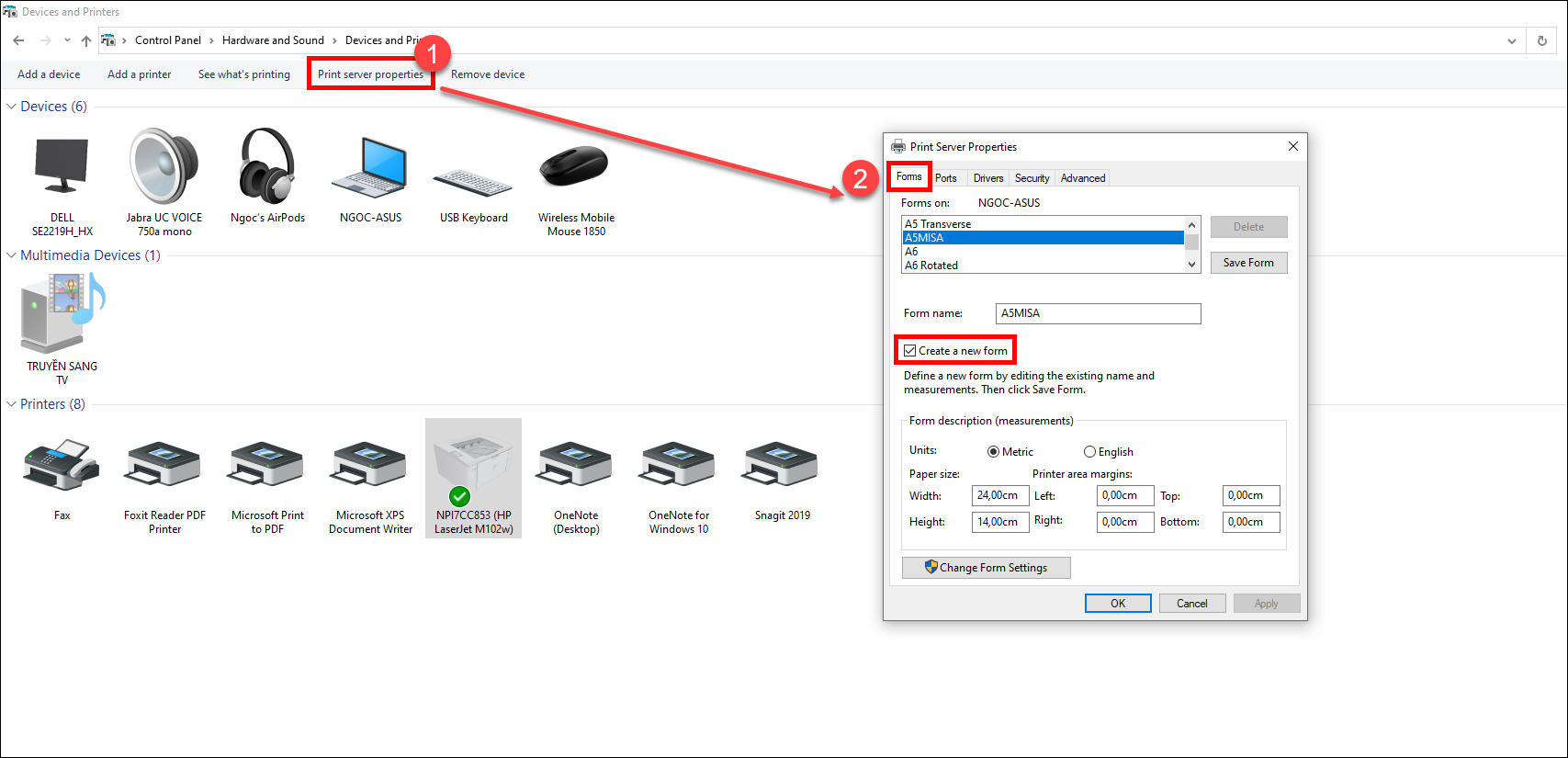 - Ấn Print server properties. Tại tab From, chọn Creat a new form