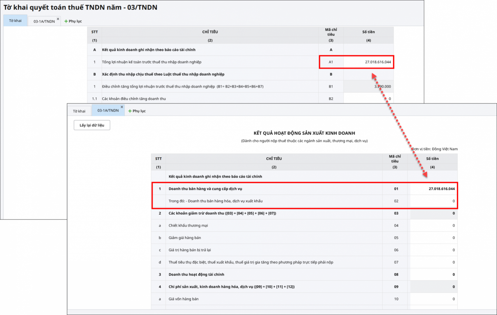 Trường hợp 2: Tờ khai quyết toán TNDN năm tổng hợp sai số liệu do Phụ lục 03-1A/TNDN chỉ lên số liệu tại chỉ tiêu Doanh thu bán hàng và cung cấp dịch vụ