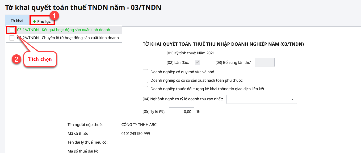 Cách xử lý: Tích chọn Phụ lục 03-1A/TNDN khi lập tờ khai quyết toán thuế TNDN năm.