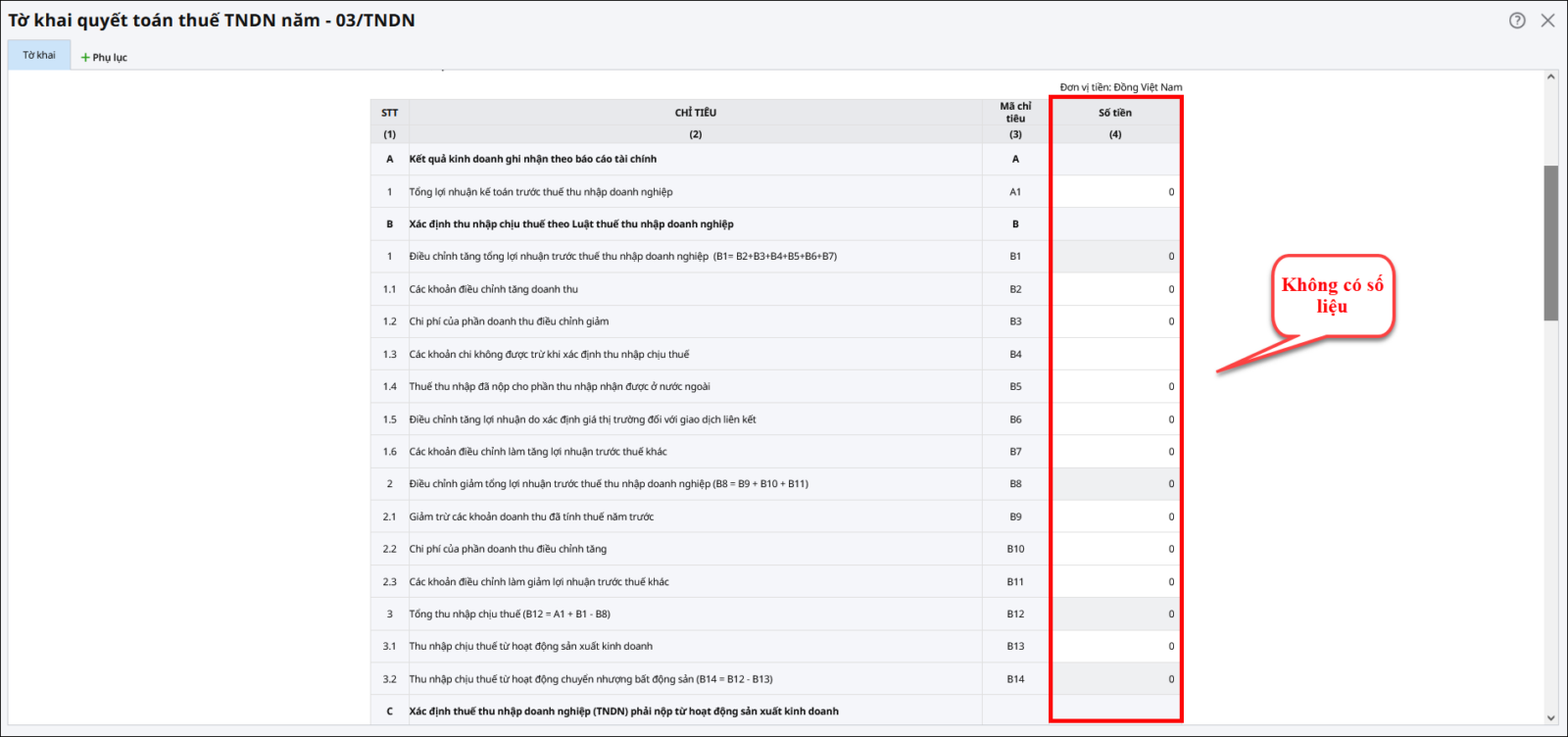 Trường hợp 1: Tờ khai quyết toán thuế TNDN năm không lên số liệu trên tất cả các chỉ tiêu