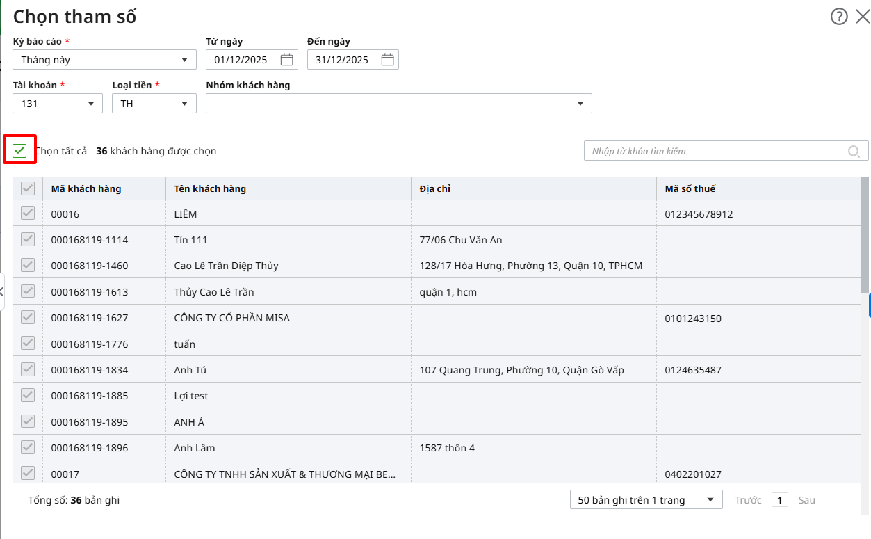 Giải pháp: Khi in báo cáo công nợ phải thu tích chọn tất cả khách hàng