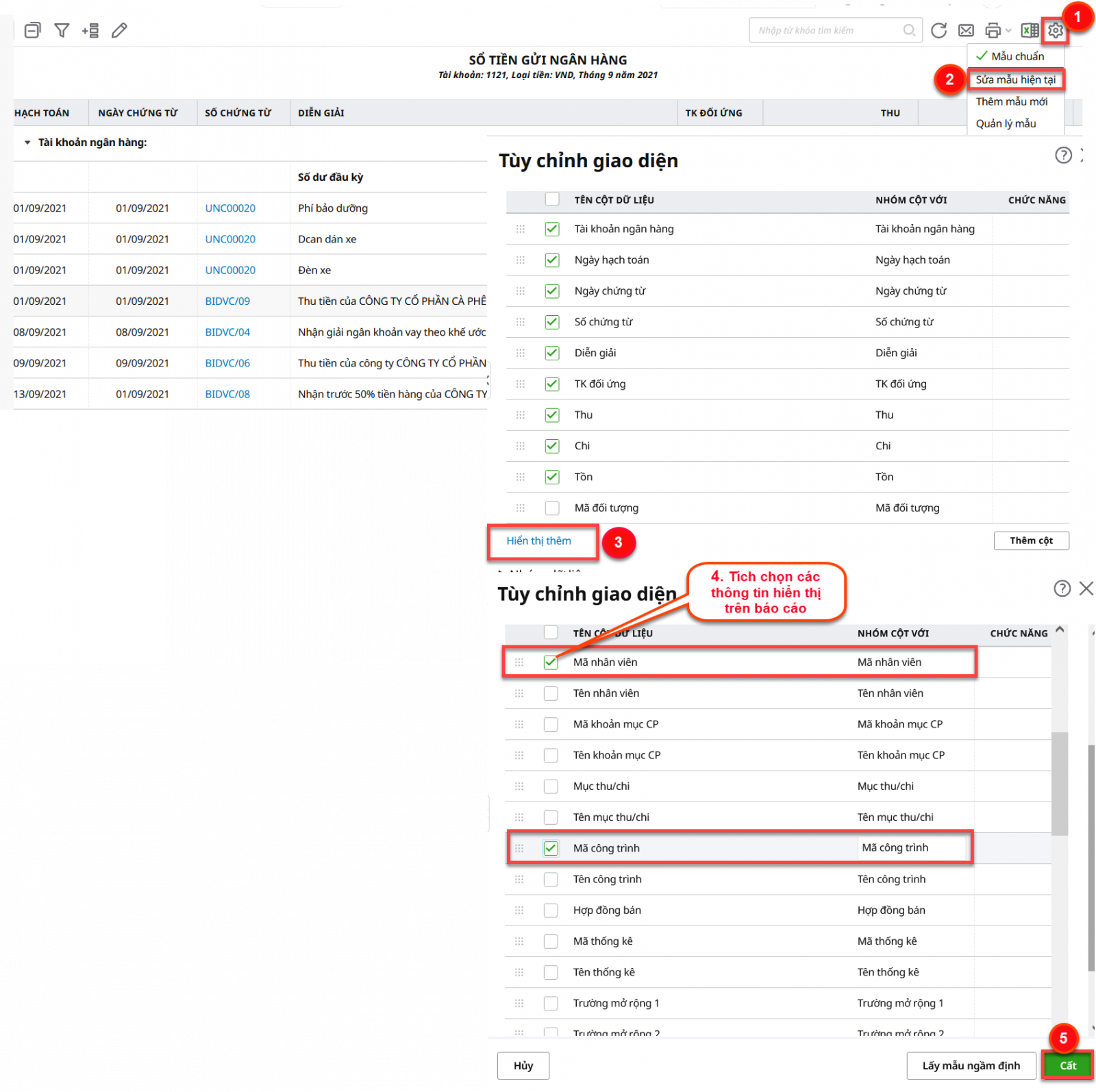 Bước 3: Tại cửa sổ Tuỳ chỉnh giao diện, chọn Hiển thị thêm rồi tích chọn các thông tin cần hiển thị trên báo cáo. Nhấn Cất