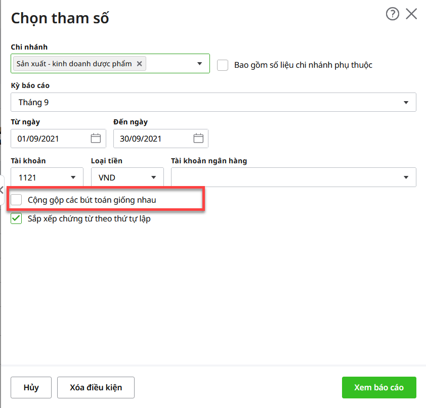 Bước 1: Khi in Sổ tiền gửi ngân hàng, không tích chọn “Cộng gộp các bút toán giống nhau”