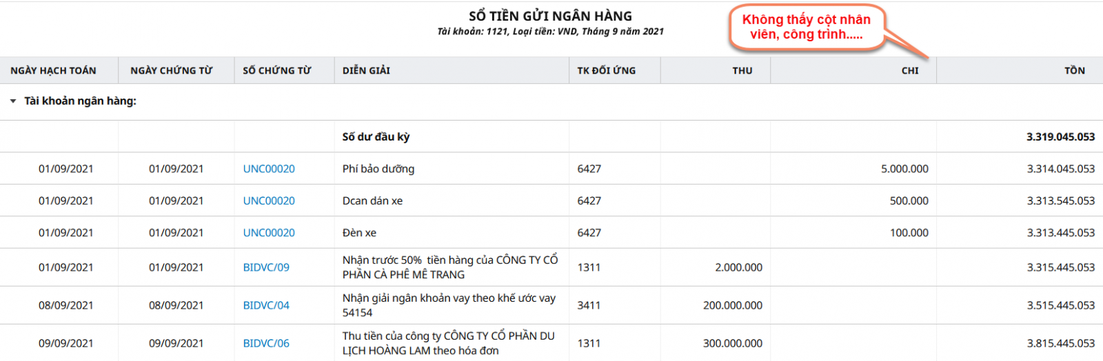Xem Sổ Tiền Gửi Ngân Hàng không hiển thị thông tin trên cột Công trình hay Nhân viên, mặc dù chứng từ hạch toán đã có thống kê theo Công trình hay Nhân viên rồi.