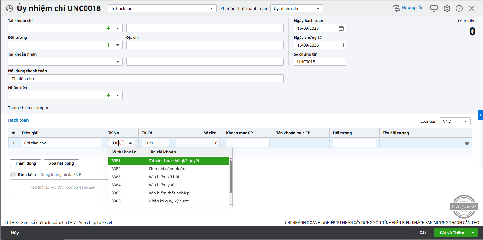 Bước 5: Lập lại chứng từ và chọn tới tài khoản cần hạch toán, thực hiện xong, nhấn Cất.