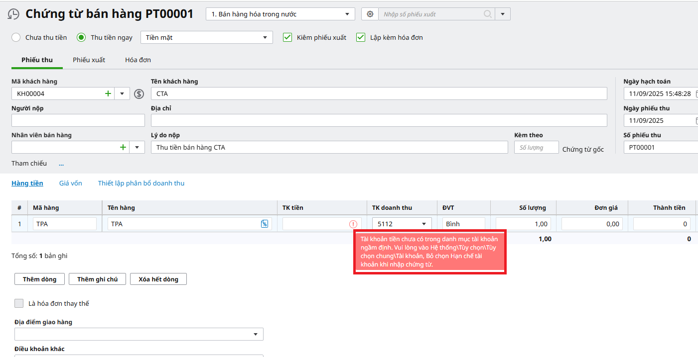 - Các tài khoản đã được khai báo trên danh mục hệ thống tài khoản, nhưng khi hạch toán tài khoản đó trên chứng từ, ô tài khoản có cảnh báo đỏ: