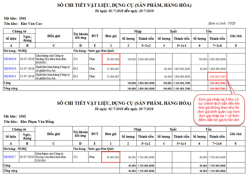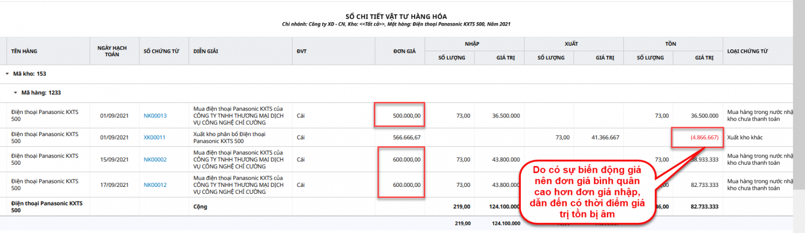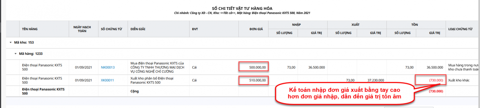 Đơn vị áp dụng phương pháp tính giá xuất kho Bình quân cuối kỳ. Do nhu cầu tăng cao hoặc nguồn cung thay đổi, dẫn đến có sự biến động giá nhập trong kỳ của mặt hàng (giá nhập sau cao hơn giá nhập trước). Cuối kỳ, sau khi tính giá xuất kho thì đơn giá xuất được tính bình quân cho cả kỳ nên khi xem sổ chi tiết vật tư hàng hóa sẽ có một số thời điểm giá trị tồn bị âm.