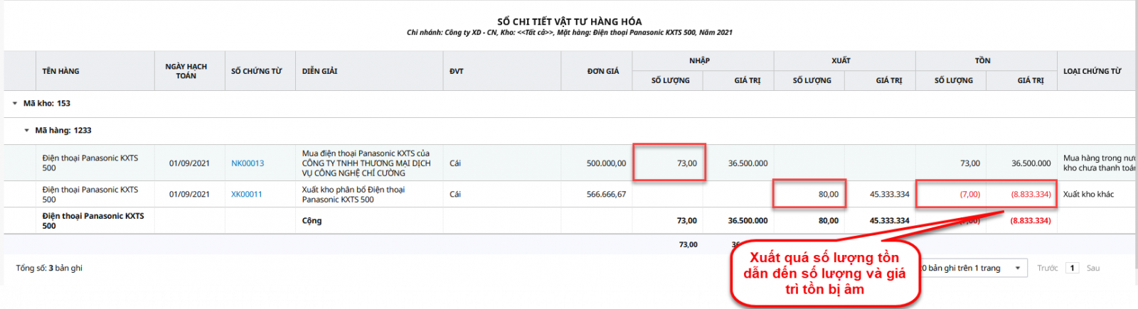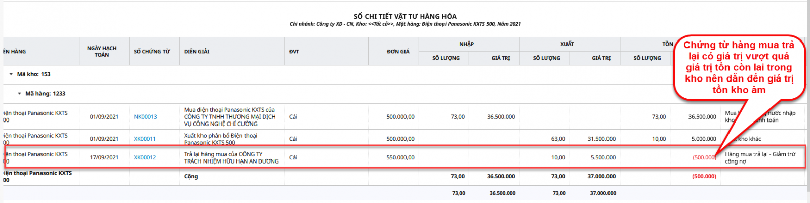 => Trường hợp số tiền trên các chứng từ này vượt quá giá trị tồn còn lại trong kho sẽ dẫn đến tình trạng giá trị tồn bị âm.