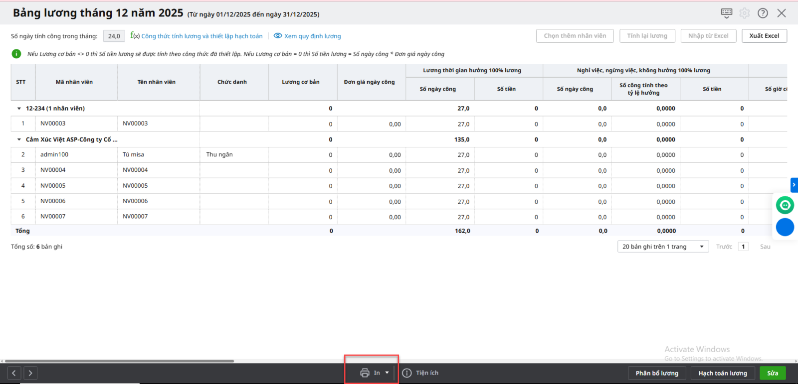 Lưu ý: Có thể chọn chức năng In để in bảng lương