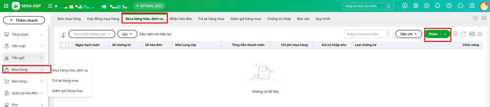Bước 1: Tại phân hệ Mua hàng, chọn tab Mua hàng hóa, dịch vụ, Nhấn Thêm\Chứng từ mua hàng.