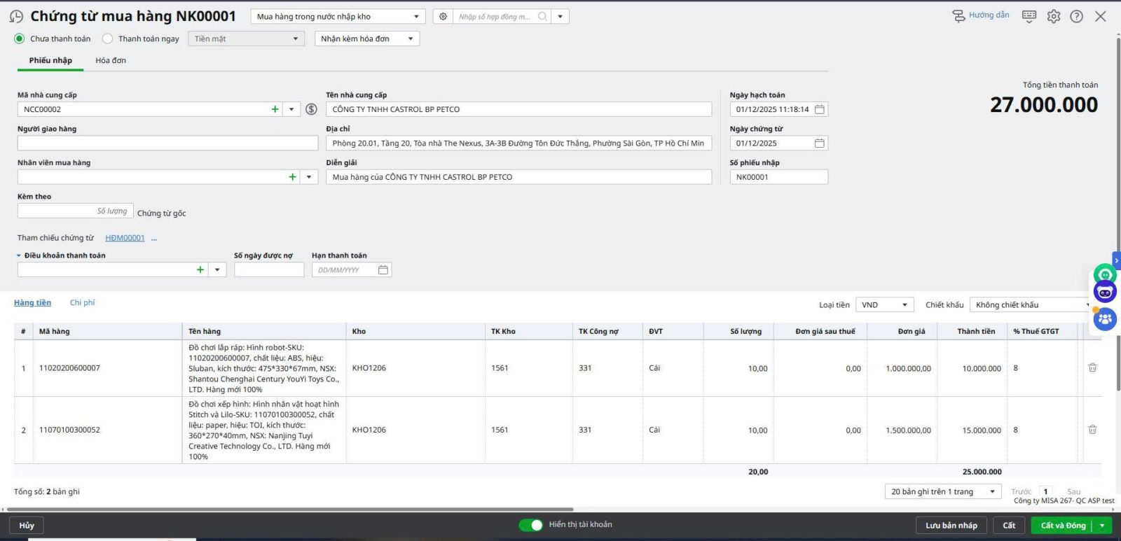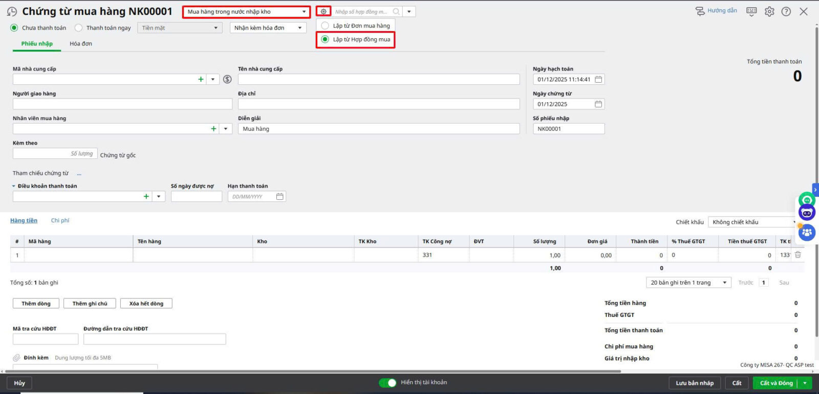 Bài viết này giúp Anh/Chị thực hiện việc lập chứng từ mua hàng dựa trên thông tin từ hợp đồng mua, đảm bảo tính chính xác, đồng bộ dữ liệu và tiết kiệm thời gian khi xử lý các nghiệp vụ mua hàng phát sinh từ hợp đồng.