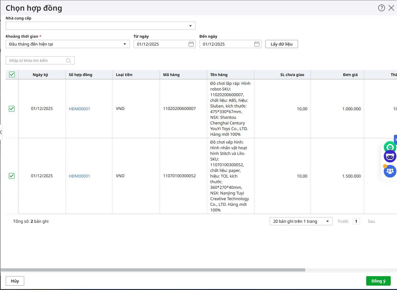 Bước 4: Tích chọn chứng từ mua hàng cần lấy thông tin sang đơn mua hàng. Nhấn Đồng ý.