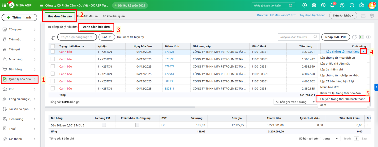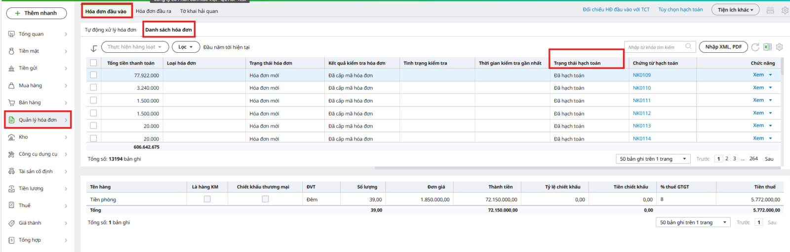 - Vào Quản lý hóa đơn/ Hóa đơn đầu vào/ Danh sách hóa đơn/ Bấm mũi tên ⏷ Tại cột Chức năng của hóa đơn cần đánh dấu/ chọn Chuyển trạng thái “Đã hạch toán”