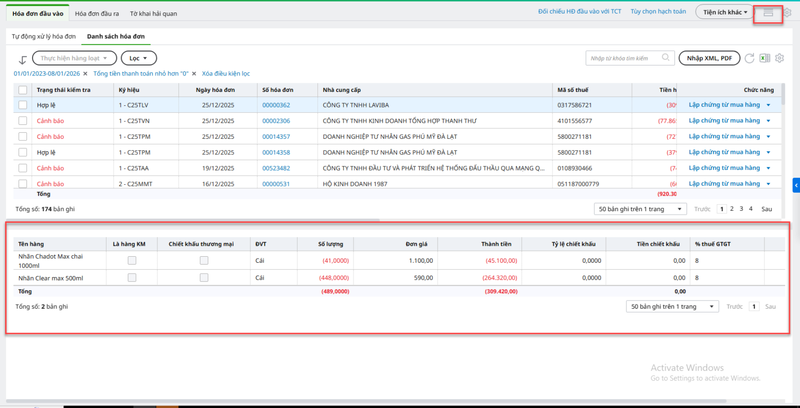 - Trường hợp muốn tủy chỉnh hiển thị danh sách hóa đơn Anh/Chị biểu tượng hình chữ nhật có 2 vạch ngang ở góc trên bên phải, đây là chức năng xem chi tiết