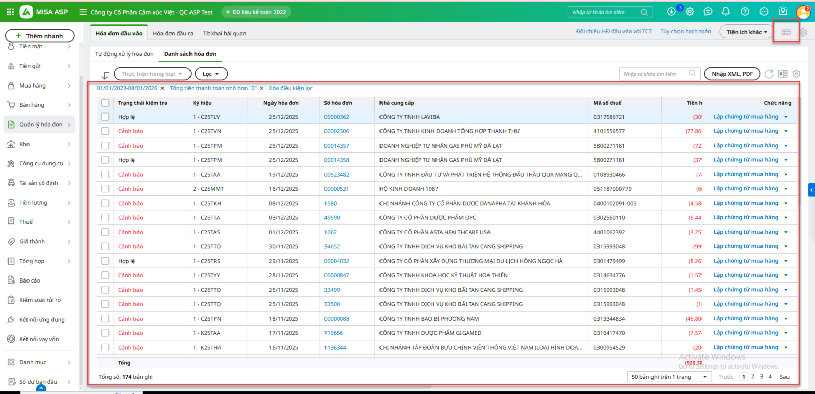 Trường hợp 2: Hạch toán hàng loạt chứng từBước 1: Tích chọn các hóa đơn mua hàng cần lập chứng từ: