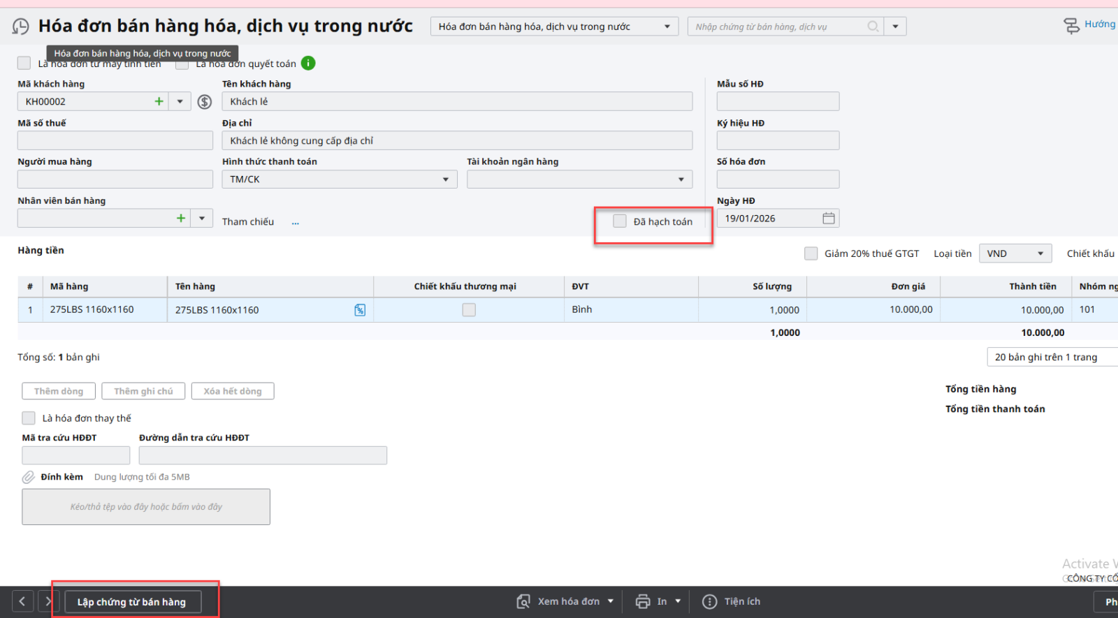 Trường hợp khi lập chứng từ bán hàng từ hóa đơn nhưng không thấy nút Lập chứng từ bán hàng thì bỏ tích ô Đã hạch toán trên hóa đơn rồi cất, khi đó nút Lập chứng từ bán hàng sẽ hiện lên