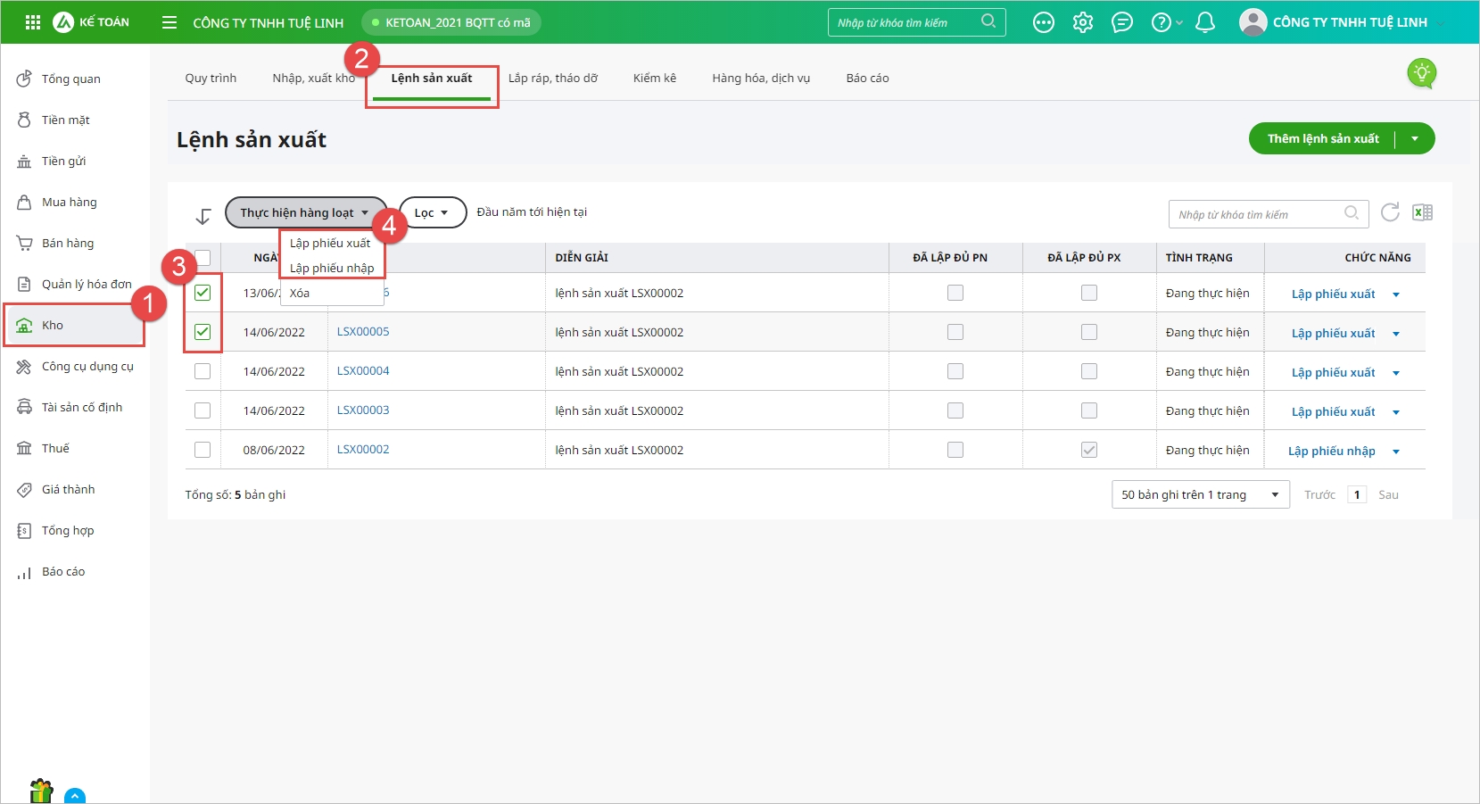 - Giới thiệu chức năng lập phiếu nhập/xuất kho hàng loạt từ lệnh sản xuất