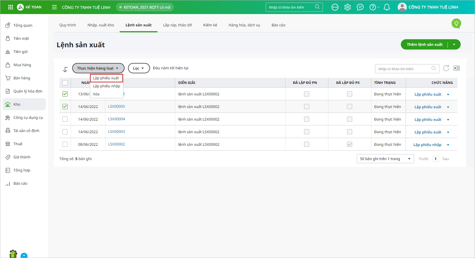 Bước 2: Trên chức năng thực hiện hàng loạt, chọn chức năng Lập phiếu xuất hoặc Lập phiếu nhập.