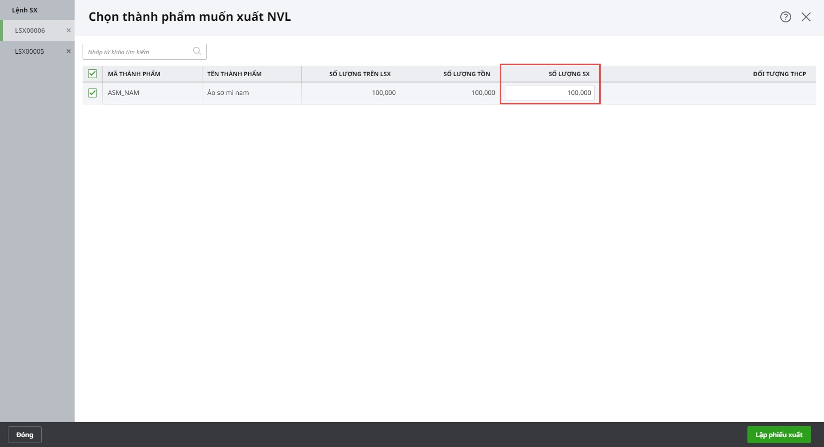 Bước 3: Nhập số lượng sản xuất cho từng lệnh sản xuất. Nhấn Lập phiếu xuất.