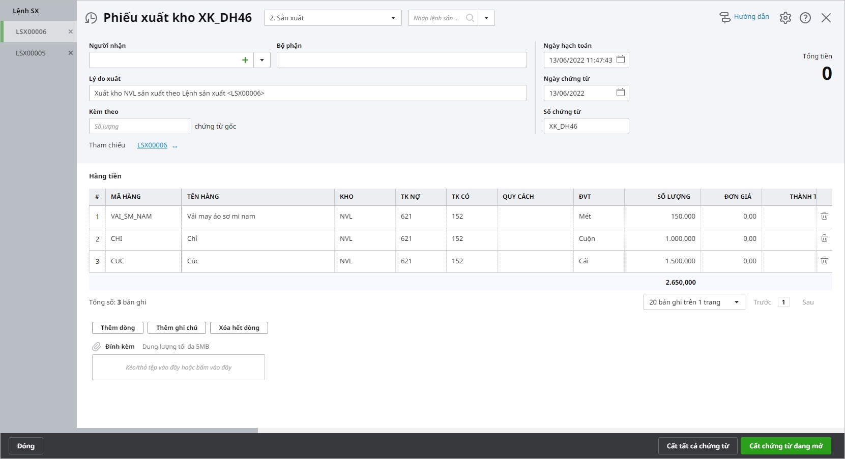 Bước 4: Chương trình tự động lấy thông tin nguyên vật liệu từ lệnh sản xuất sang phiếu xuất. Kiểm tra lại các thông tin trên phiếu xuất, sau đó chọn Cất tất cả chứng từ hoặc Cất chứng từ đang mở.