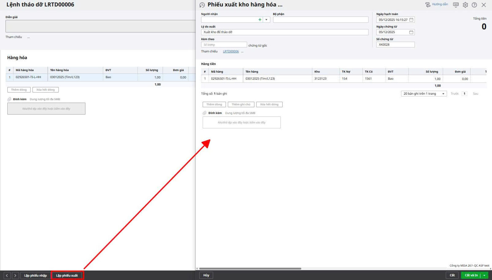Bước 1. Sau khi cất giữ lệnh tháo dỡ, chọn chức năng Lập phiếu xuất.