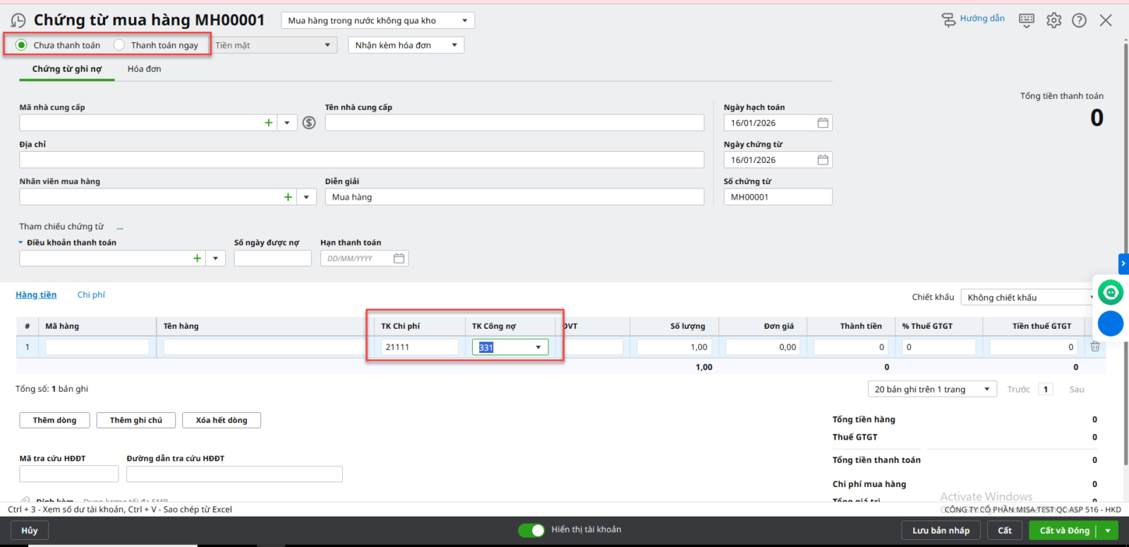Khai báo các thông tin trên chứng từ bao gồm thông tin chung và tab hạch toán.