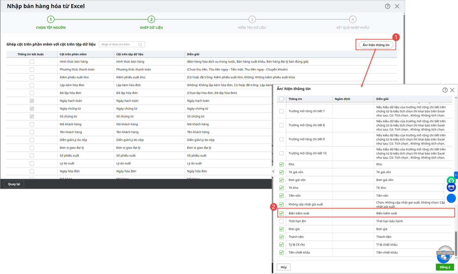 - Chọn chức năng Ẩn/hiện thông tin và tích chọn hiển thị thông tin Biển kiểm soát nếu chưa thấy cột này tại bước ghép dữ liệu: