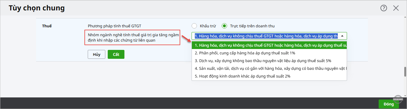 - Tại mục Thuế, người dùng có thể chọn 1 trong 5 nhóm ngành nghề tính thuế giá trị gia tăng ngầm định khi nhập các chứng từ liên quan: