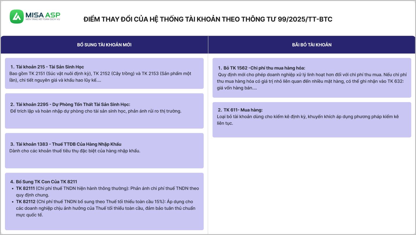 • Thông tư 99/2025/TT-BTC đã bãi bỏbổ sung một số tài khoản kế toán cấp 1 và cấp 2 mới để phản ánh chính xác hơn bản chất giao dịch và đặc thù ngành nghề, đặc biệt trong lĩnh vực nông nghiệp, xuất nhập khẩu và thuế tiêu thụ đặc biệt: