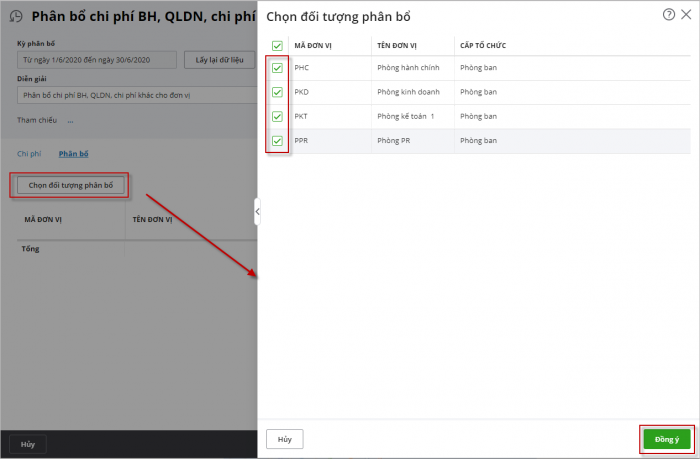 • Tích chọn các đối tượng bị phân bổ, sau đó nhấn Đồng ý.