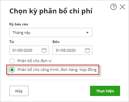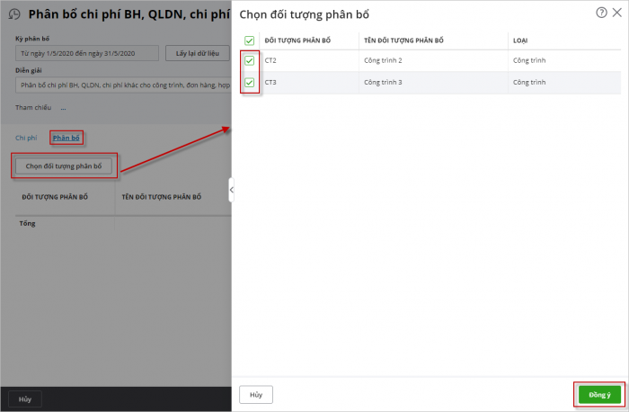 Bước 3: Chọn kỳ phân bổ tương ứng, tích chọn Phân bổ cho công trình, đơn hàng, hợp đồng.