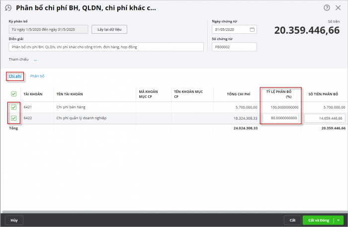 • Nhập lại tỷ lệ phân bổ nếu không muốn phân bổ hết 100% khoản chi phí tương ứng.