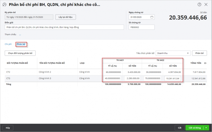 • Phân bổ chi phí bán hàng, quản lý doanh nghiệp, chi phí khác cho các công trình, đơn hàng, hợp đồng.