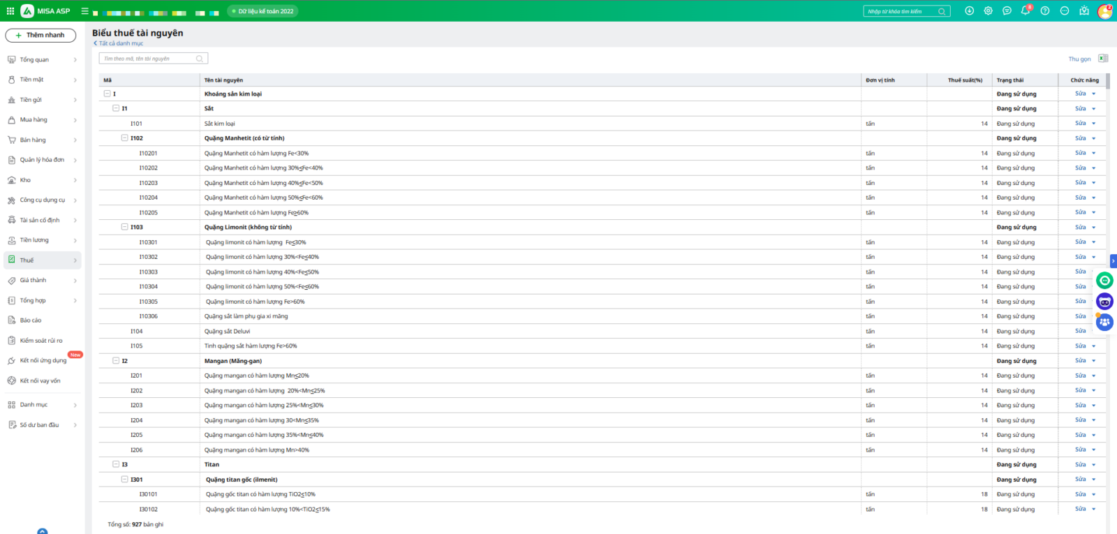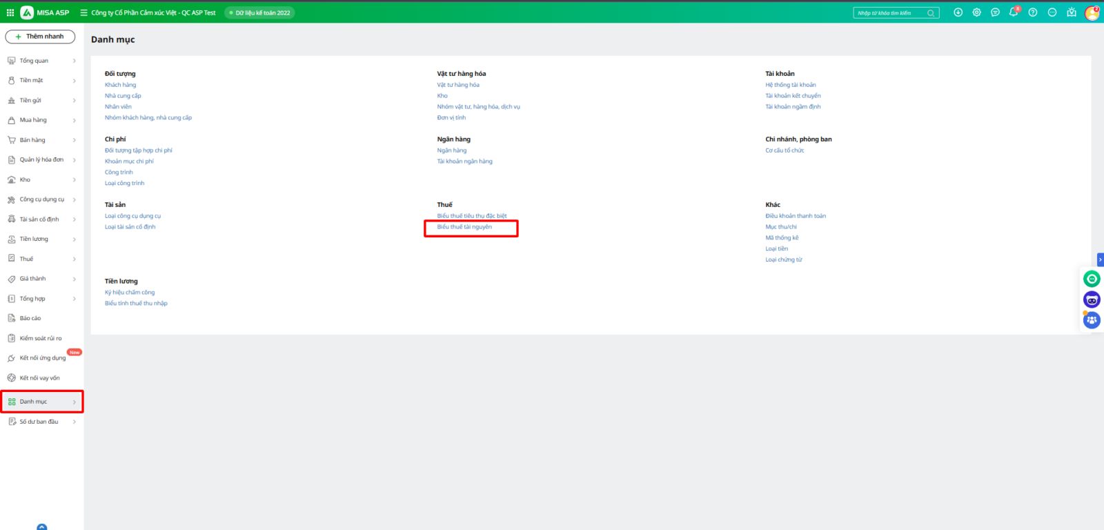 • Vào Phân hệ Danh mục, chọn Biểu thuế tài nguyên: