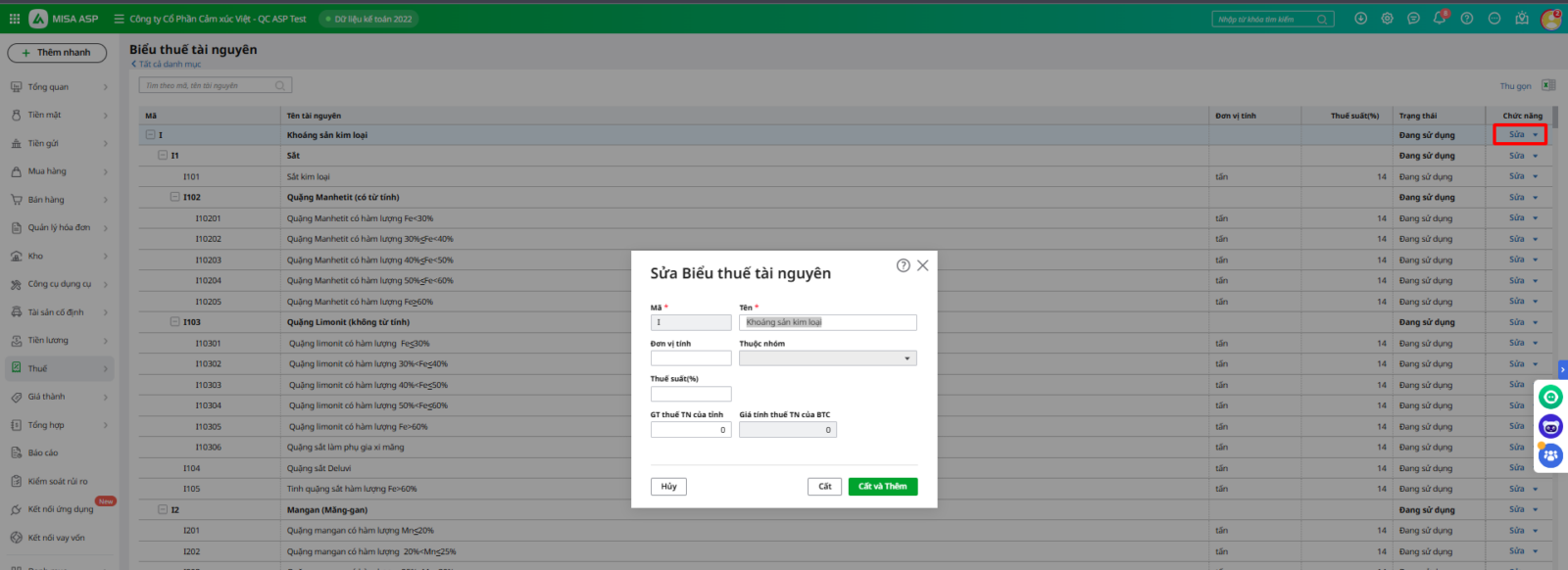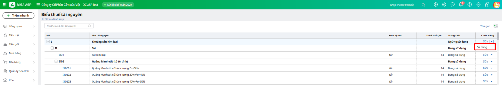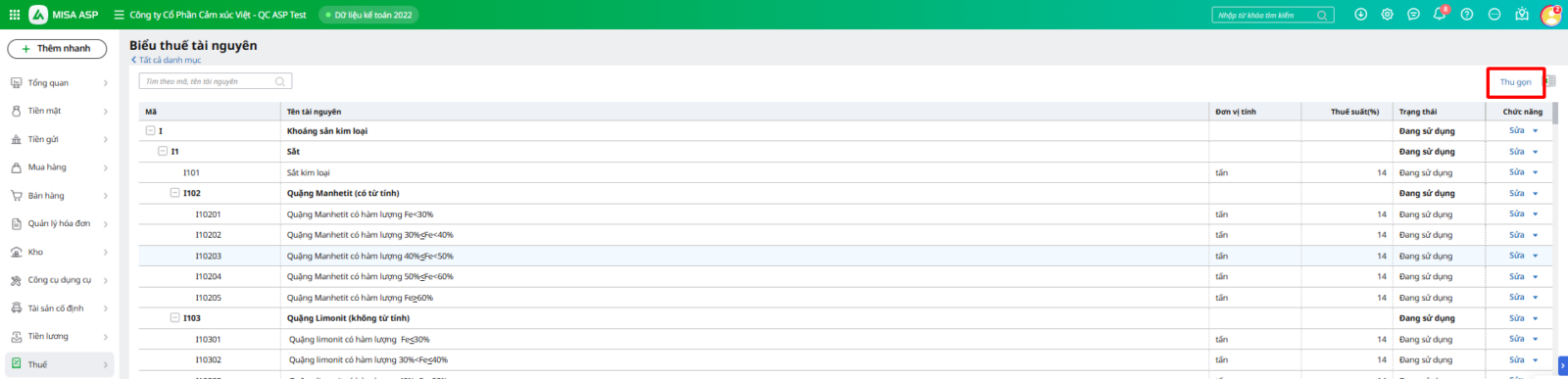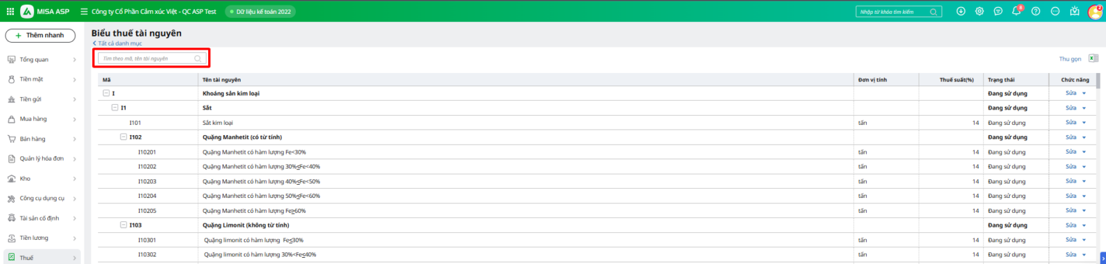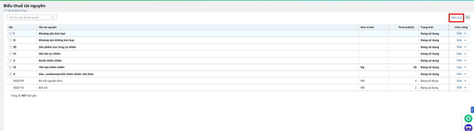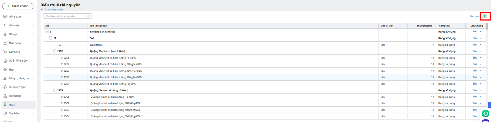 Nội dung bài viết bao gồm hướng dẫn truy cập danh mục biểu thuế tài nguyên, thao tác mở rộng, thu gọn, xuất Excel, tìm kiếm, sửa, sử dụng và ngừng sử dụng tài nguyên.