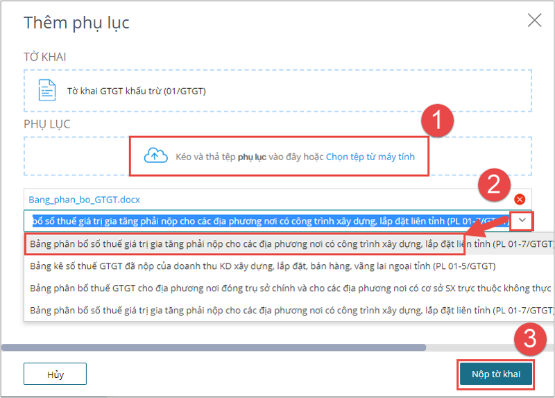 • Đính kèm phụ lục lên tờ khai (bằng cách kéo thả hoặc chọn tệp từ máy tính tương tự trường hợp nộp tờ khai) và chọn Loại phụ lục
