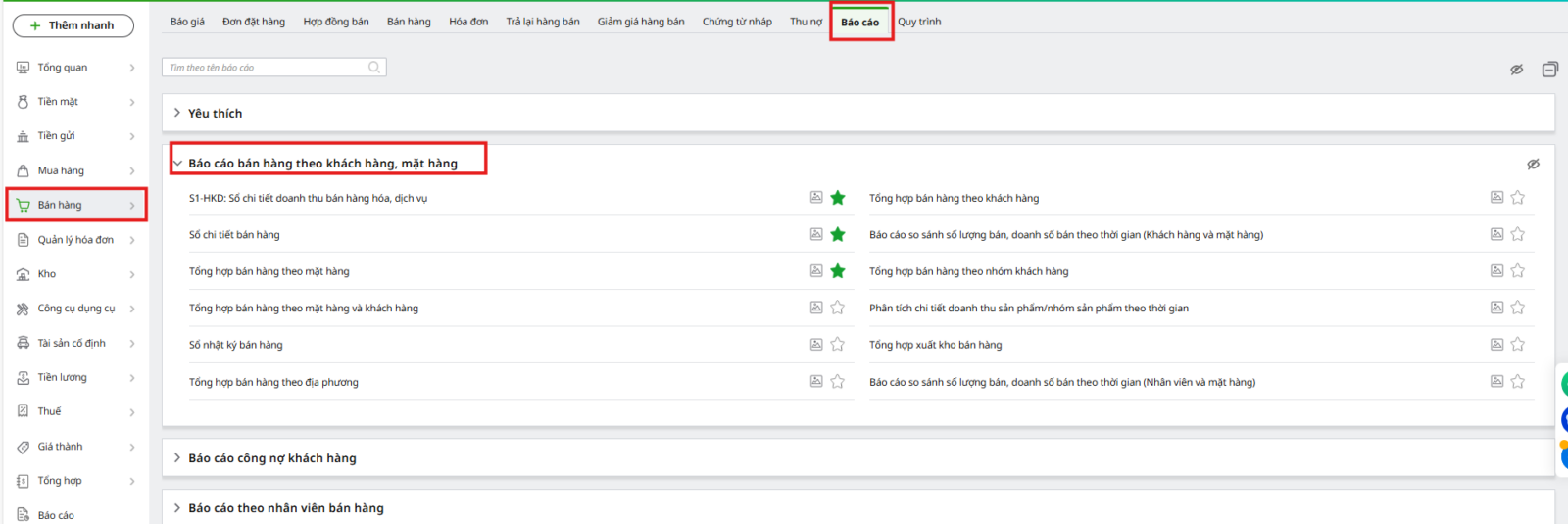 Bước 1: Vào phân hệ Bán hàng\tab Báo cáo, chọn mũi tên ⏷ tại Báo cáo bán hàng theo Khách hàng, mặt hàng, nhấn xem báo cáo mẫu S1-HKD: Sổ chi tiết doanh thu bán hàng hóa, dịch vụ