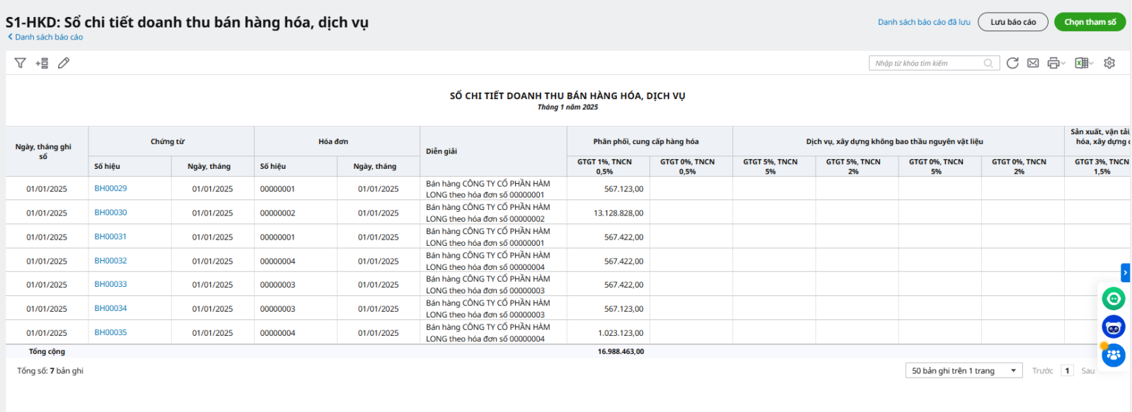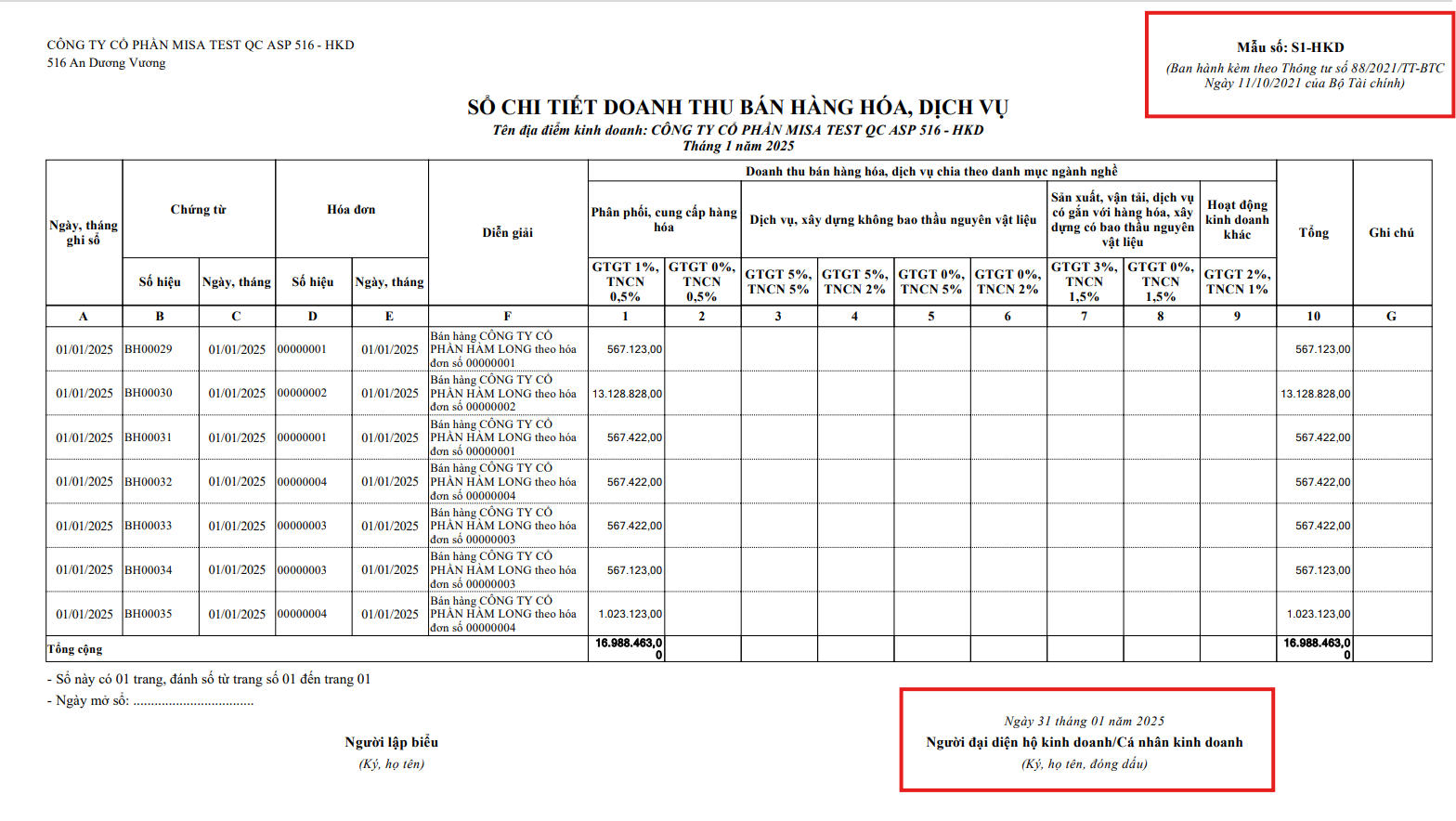 Chương trình đáp ứng Sổ chi tiết doanh thu bán hàng hóa, dịch vụ (Mẫu số S1-HKD) theo Thông tư 88/2021/TT-BTC.
