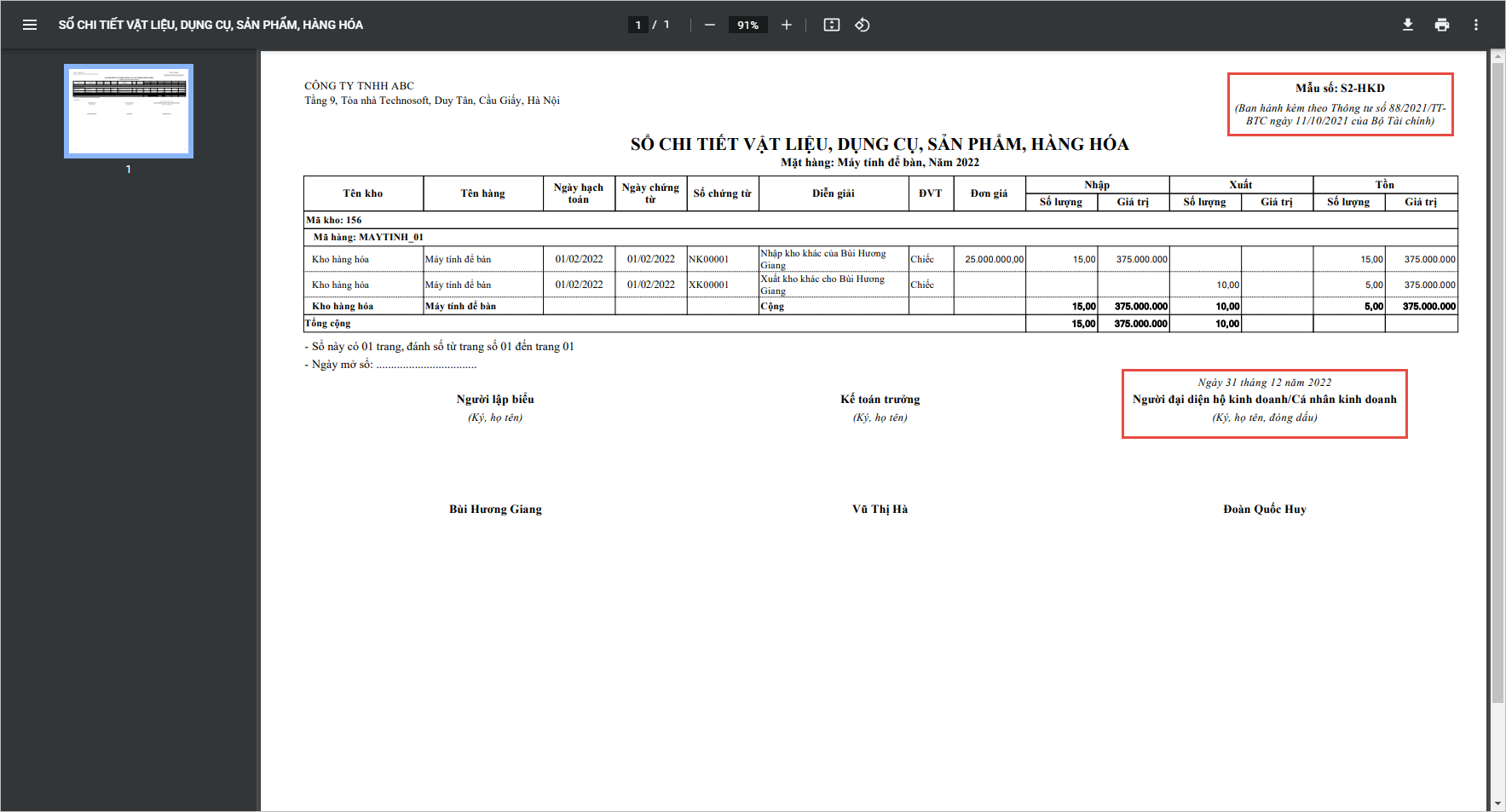 - Khi Anh/Chị thực hiện in sổ chi tiết vật liệu, dụng cụ, sản phẩm, hàng hóa; chương trình sẽ hiển thị mẫu số và chân chữ ký sử dụng cho hộ kinh doanh, cá nhân kinh doanh