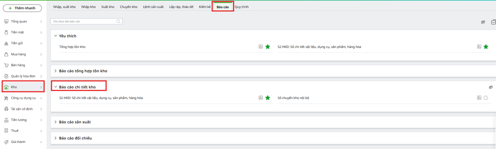Bước 1: Vào phân hệ Kho\tab Báo cáo, chọn mũi tên ⏷ tại Báo cáo chi tiết Kho, nhấn xem báo cáo mẫu S2-HKD: Sổ chi tiết vật liệu, dụng cụ, sản phẩm, hàng hóa