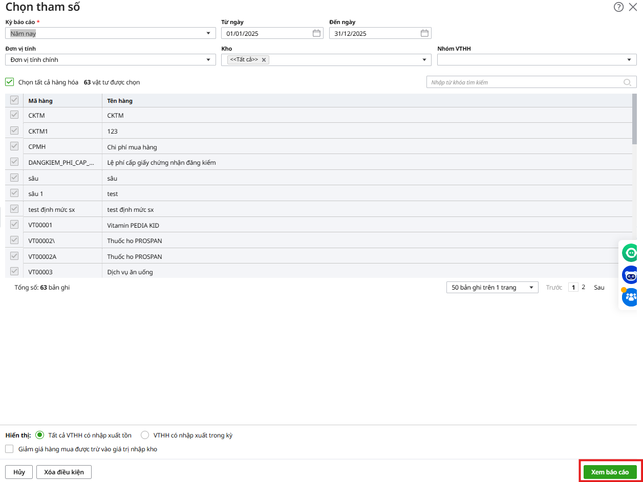 Bước 2: Chọn tham số cần xem, nhấn Xem báo cáo.