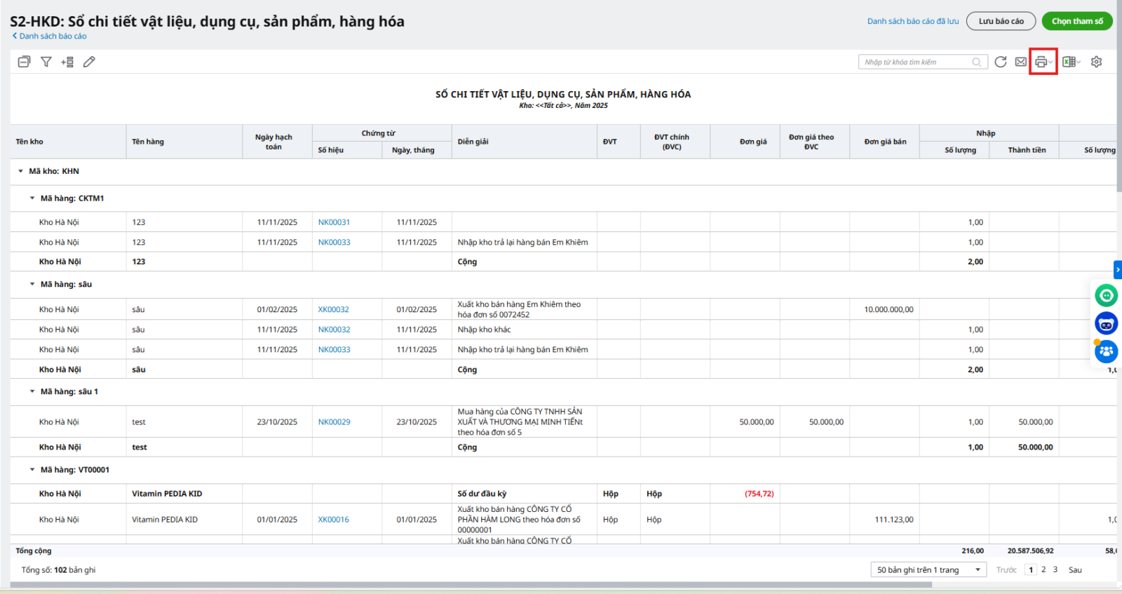 Chương trình đáp ứng mẫu sổ chi tiết vật liệu, dụng cụ, sản phẩm, hàng hóa (mẫu số S2-HKD) theo Thông tư 88/2021/TT-BTC.