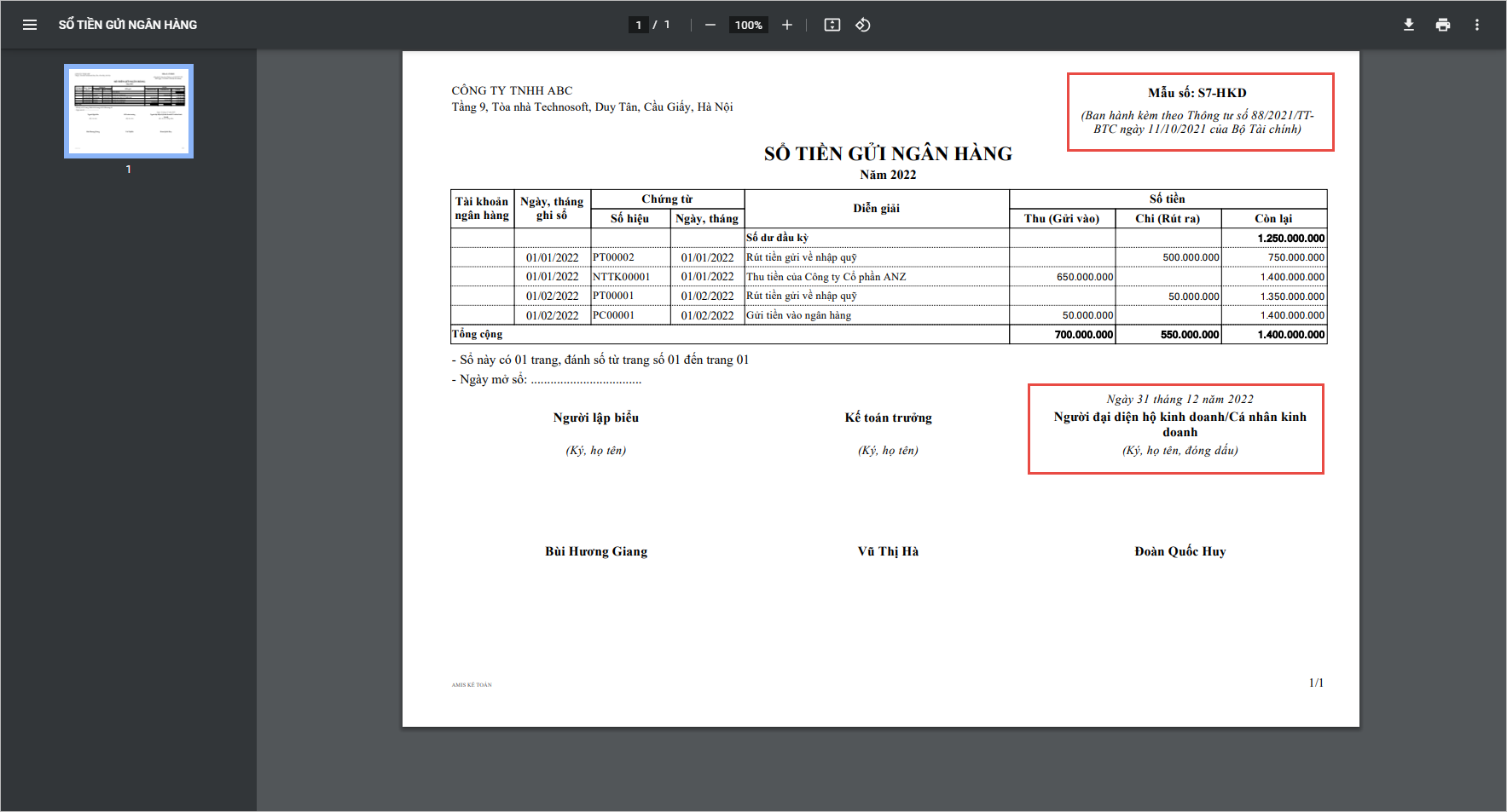 Khi Anh/Chị thực hiện in sổ tiền gửi ngân hàng, chương trình sẽ hiển thị mẫu số và chân chữ ký sử dụng cho hộ kinh doanh, cá nhân kinh doanh theo đúng quy định tại Thông tư 88/2021/TT-BTC.