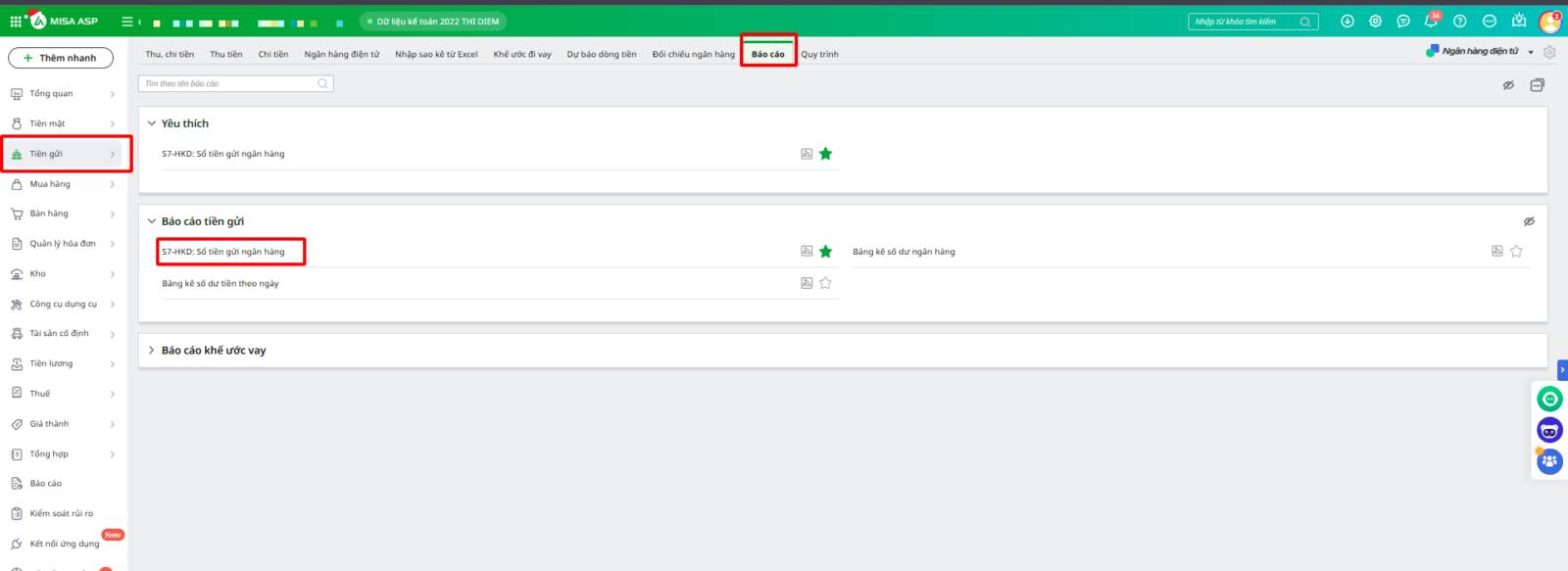 Bước 1: Vào phân hệ Tiền gửi\tab Báo cáo\nhóm Báo cáo tiền gửi, chọn Sổ tiền gửi ngân hàng (hoặc phân hệ Báo cáo\tab Tất cả\Tiền gửi\nhóm Báo cáo tiền gửi\chọn Sổ tiền gửi ngân hàng)