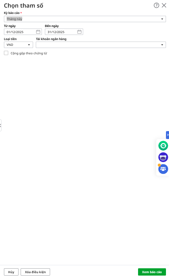 Bước 2: Chọn Tham số các nội dung: Kỳ báo cáo, Loại tiền, Tài khoản ngân hàng\nhấn Xem báo cáo.