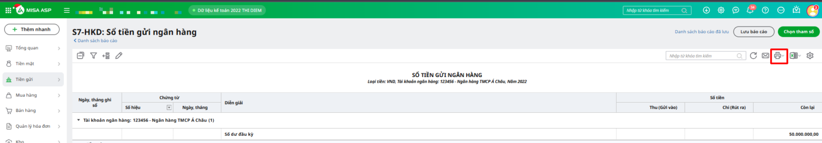 Bước 3: Trên giao diện báo cáo sổ S7-HKD: Sổ tiền gửi ngân hàng, nhấn vào biểu tượng In trên thanh công cụ.