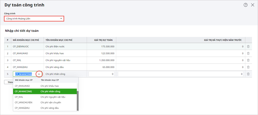 Mục đích: Hướng dẫn thiết lập dự toán công trình, ghi nhận chi phí theo từng khoản mục và xem báo cáo so sánh chi phí dự toán với thực tế trên phần mềm.