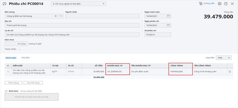 Bước 2: Ghi nhận chi phí công trình theo từng khoản mục chi phíCác chi phí phát sinh có thể được ghi nhận ở các phân hệ Tiền mặt, Tiền gửi, Mua hàng, Kho, Tổng hợp. Ví dụ Tiền mặt: Lưu ý: Các chi phí khi ghi nhận phải được gắn mã khoản mục chi phí và được chọn chi tiết tới công trình.