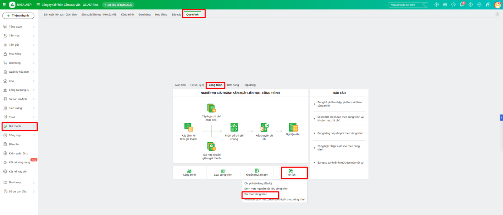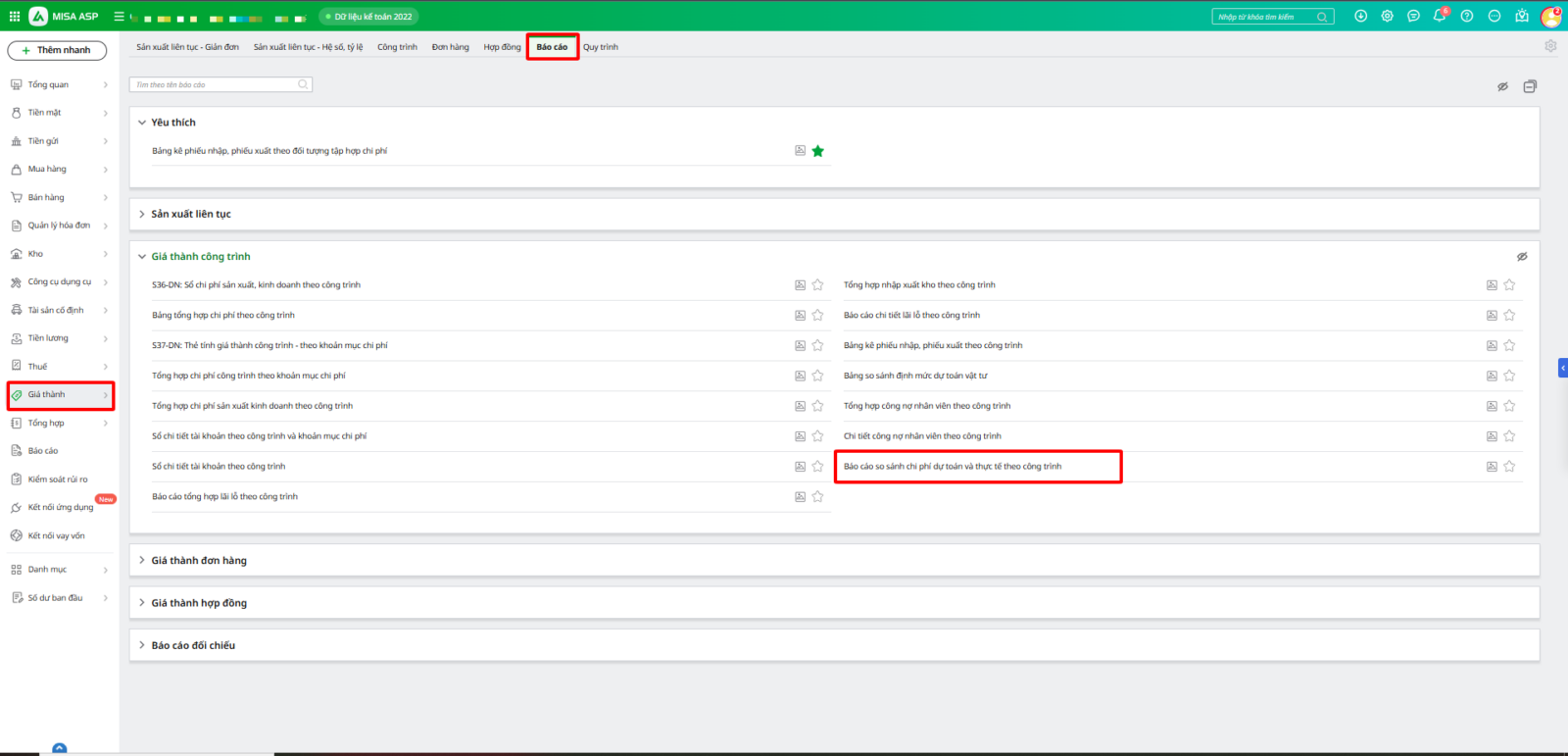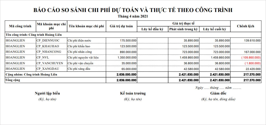 Bước 3: Xem báo cáo so sánh chi phí dự toán và thực tế công trình